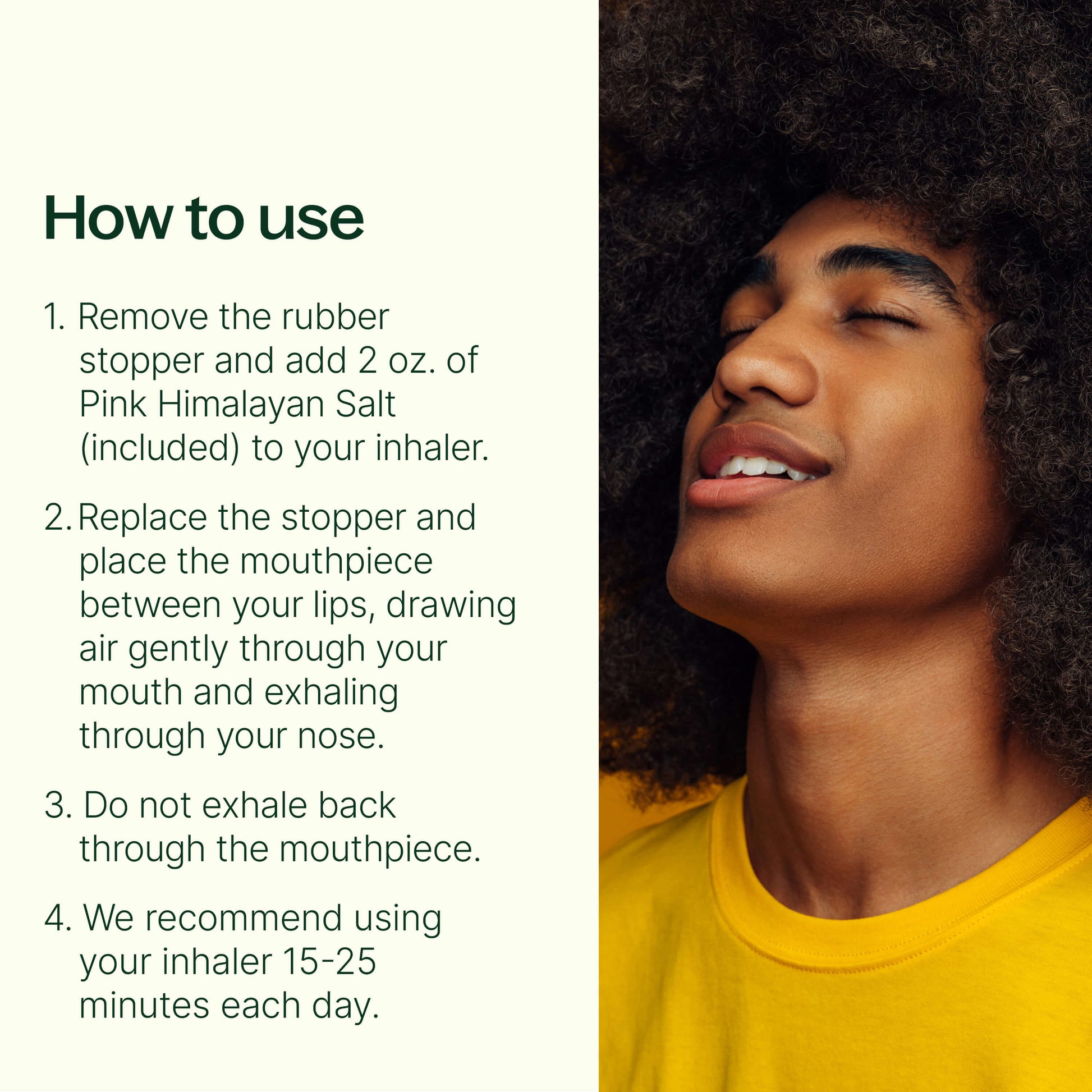 First, remove the rubber stopper and add two ounces of Pink Himalayan Salt (included) to your inhaler. Replace the stopper and place the mouthpiece between your lips, drawing air gently through your mouth and exhaling through your nose. Do not exhale back through the mouthpiece. This will cause moisture in the salt and you will need to replace the salt. You may experience some coughing or sneezing when the inhaling process starts. We recommend using your inhaler 15-25 minutes each day.