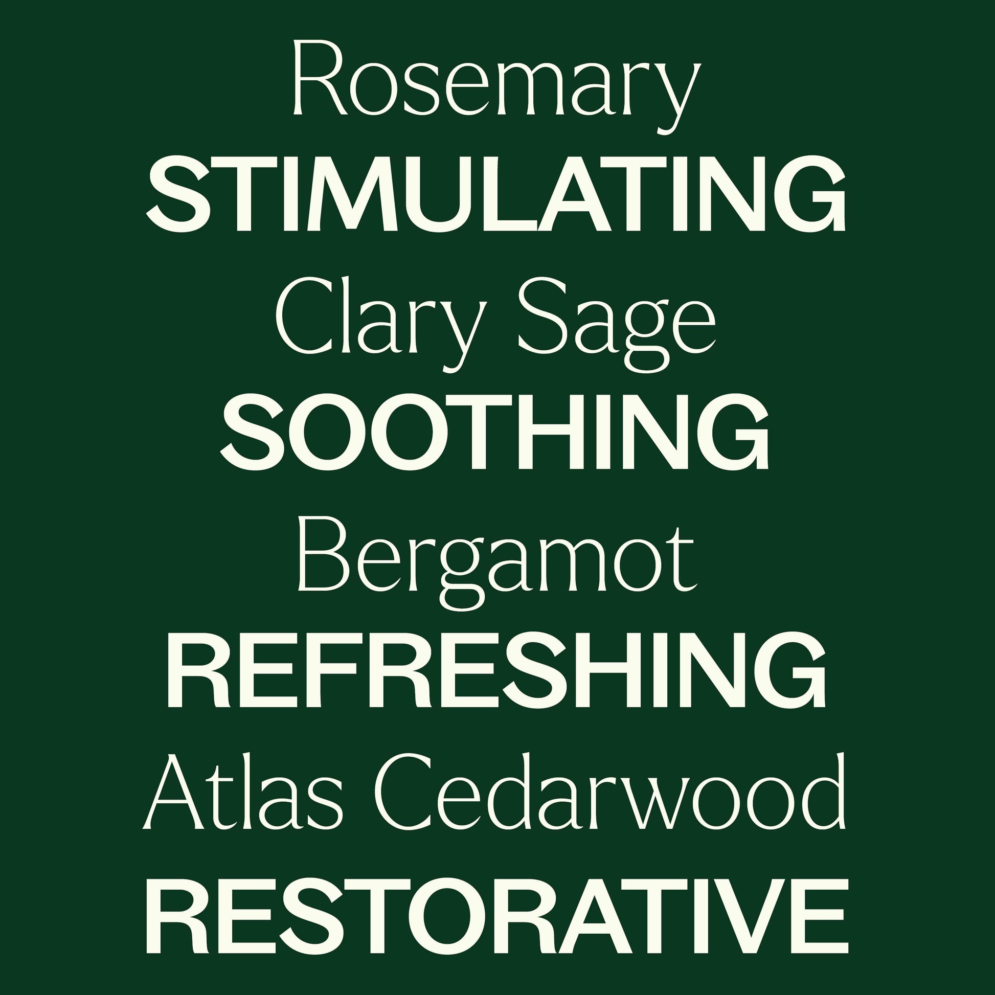 Rosmarinus Officinalis (Rosemary) Leaf/Stem Oil, Salvia Sclarea (Clary Sage) Oil, Citrus Aurantium Bergamia (Bergamot) Peel Oil, Cedrus Atlantica (Atlas Cedarwood) Wood Oil, Lavandula Intermedia (Lavandin) Flower/Leaf/Stem Oil, Copaifera Officinalis (Balsam Copaiba) Resin