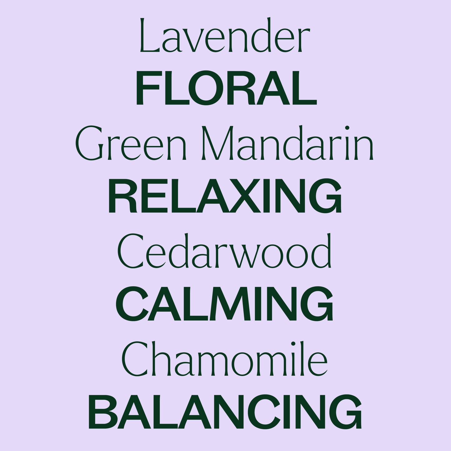Lavandula Angustifolia (Lavender) Oil, Origanum Majorana (Sweet Marjoram) Flower/Leaf/Stem Oil, Citrus Nobilis (Green Mandarin) Peel Oil, Cedrus Atlantica (Atlas Cedarwood) Wood Oil, Pogostemon Cablin (Patchouli) Leaf Oil, Salvia Sclarea (Clary Sage) Oil, Anthemis Nobilis (Roman Chamomile) Flower Oil, Tanacetum Annuum (Blue Tansy) Flower/Leaf/Stem Oil