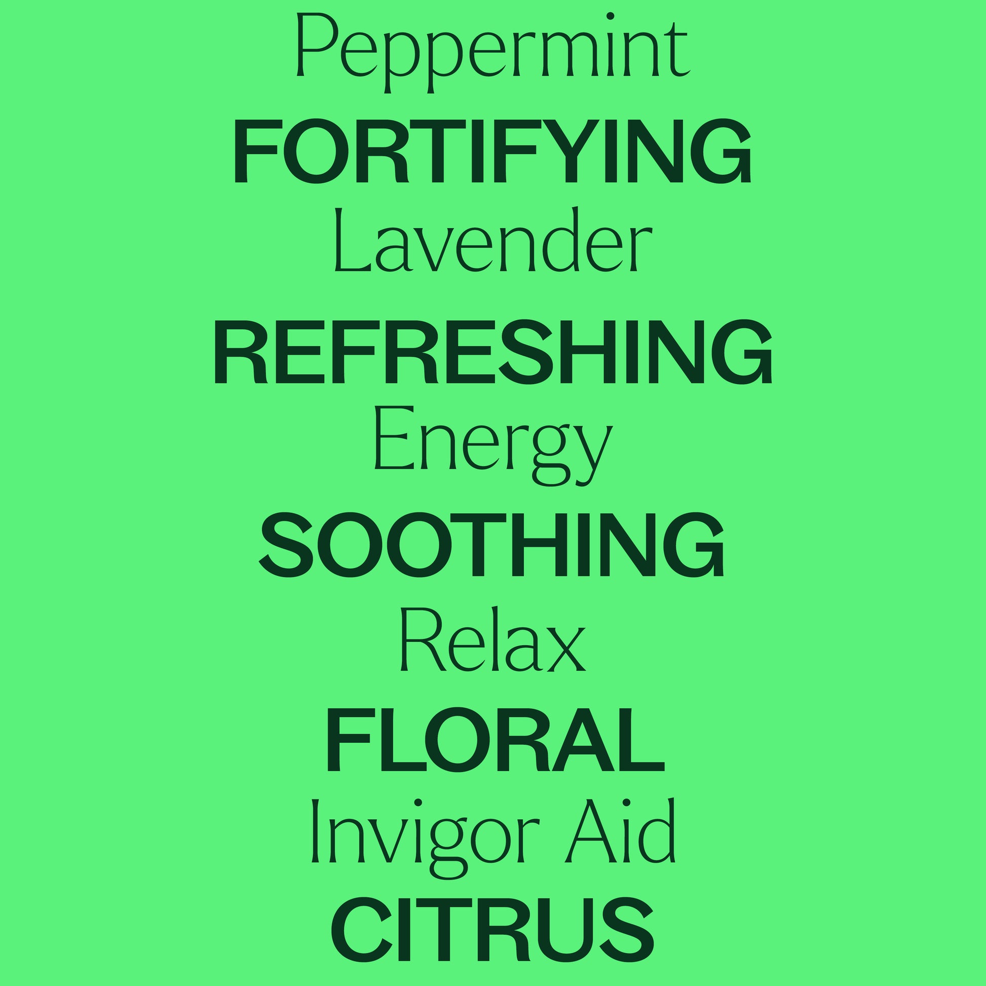Energy: Citrus Aurantium Dulcis (Blood Orange) Peel Oil, Mentha Piperita (Peppermint) Oil, Citrus Limon (Lemon) Peel Oil, Zingiber Officinale (Ginger) Root Extract, Eucalyptus Globulus Leaf Oil, Pelargonium Graveolens (Egyptian Geranium) Leaf Oil