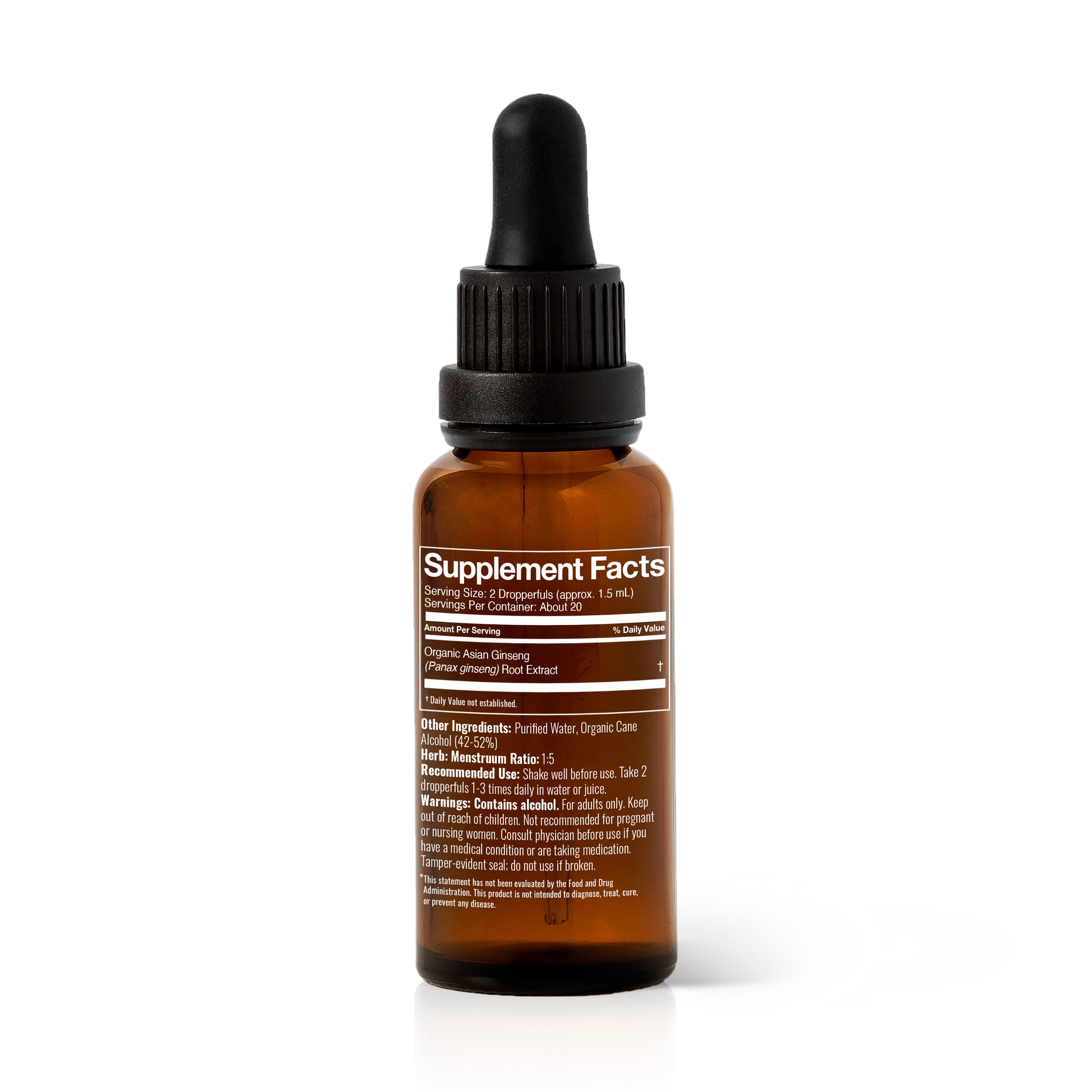 Derived from the roots of organically grown Asian Ginseng (Panax ginseng) plants, this tincture captures the full spectrum of benefits this amazing plant has to offer. By using a potent organic alcohol extraction, our tincture offers the broadest range of water-soluble and fat-soluble phytochemicals found within the Asian Ginseng root while requiring much less plant material than other solvents, such as glycerin. It also acts as a superior preservative, maintaining the potency and integrity of the extract over several years.
